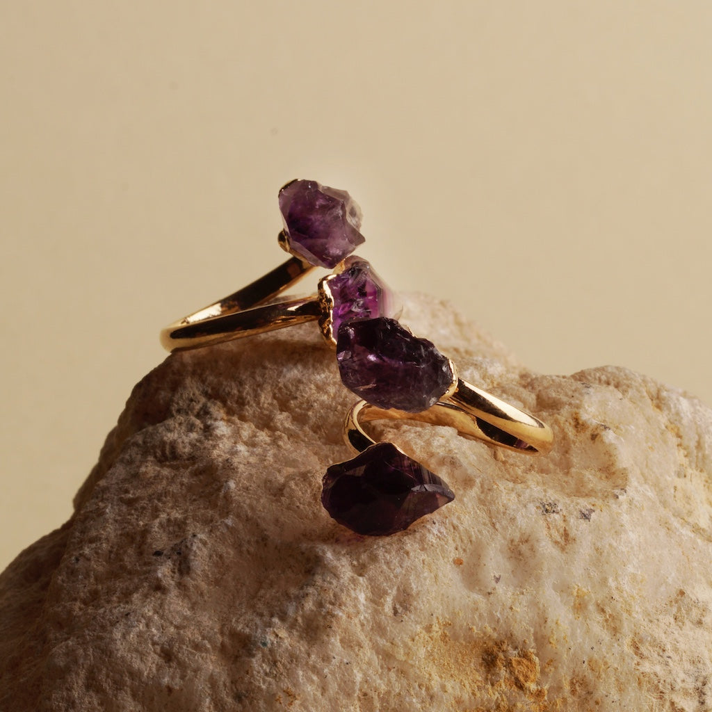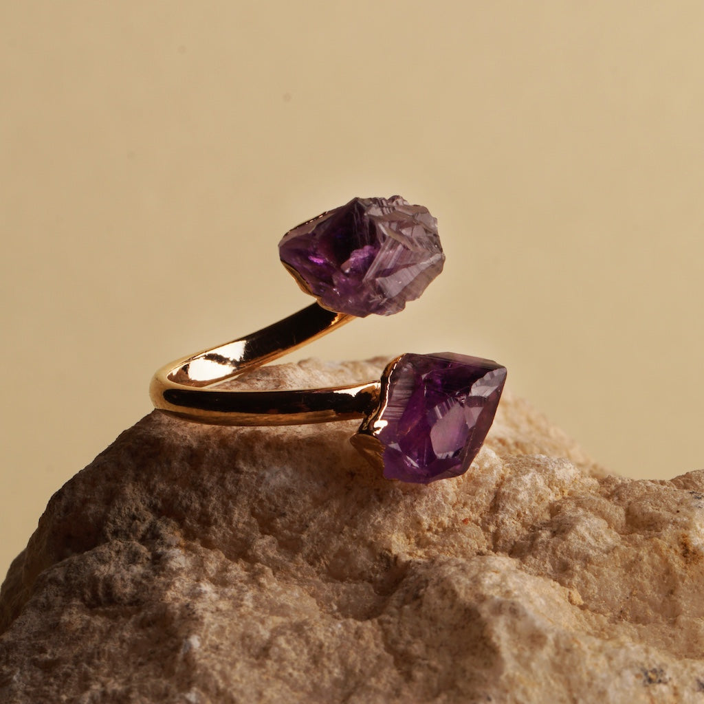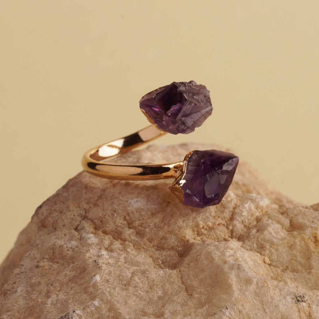 💜 Stone: Genuine Amethyst • 💫 Material: Gold-plated metal • 🔮 Design: Adjustable dual-stone band