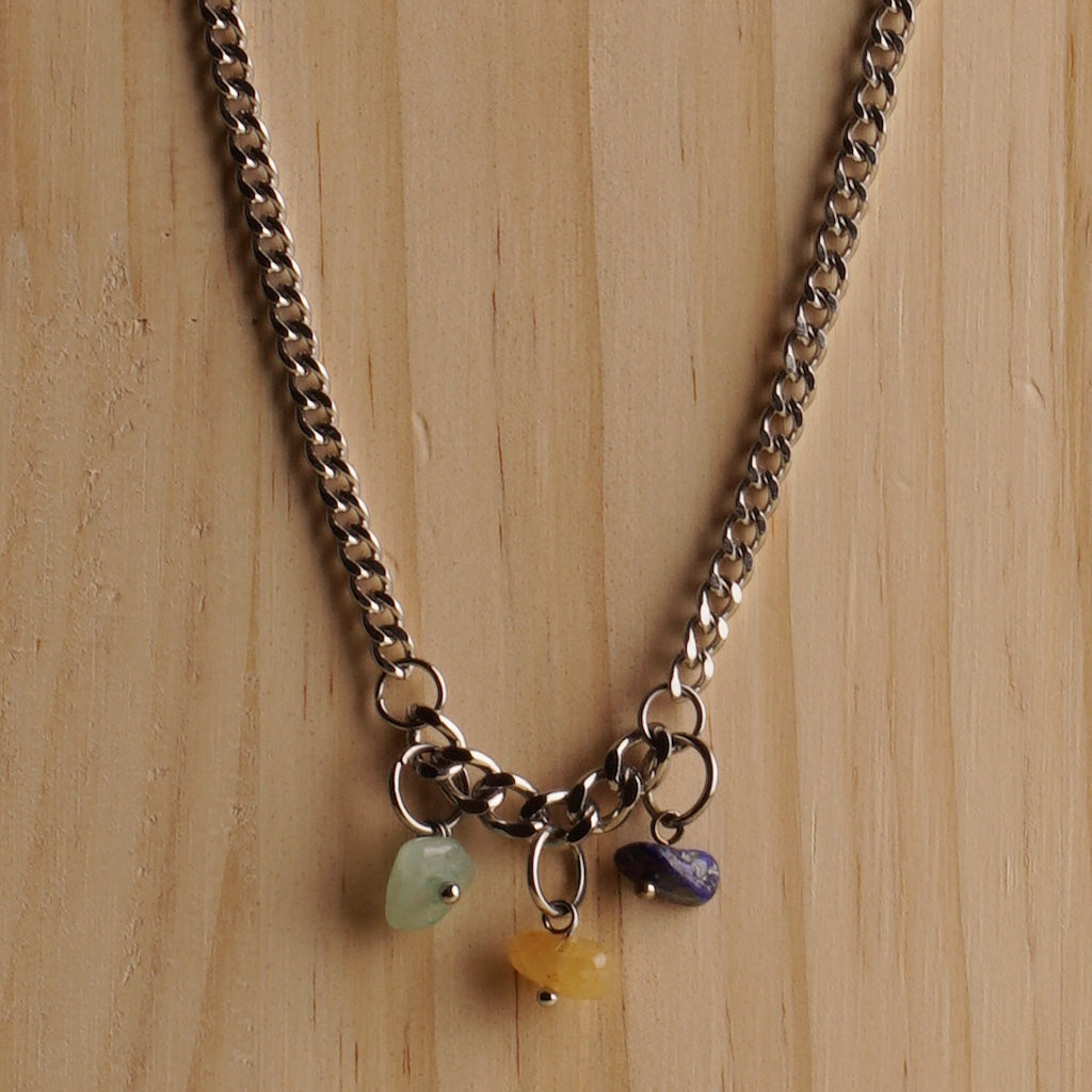 Each stone is naturally unique in tone and texture, capturing the vibrant spirit of Brazil. The green Amazonite fosters balance and serenity, the yellow Jasper energizes and encourages optimism, and the deep blue Sodalite supports clarity and thoughtful communication. Together, they form a playful, meaningful accent on a sleek, modern Cuban chain.