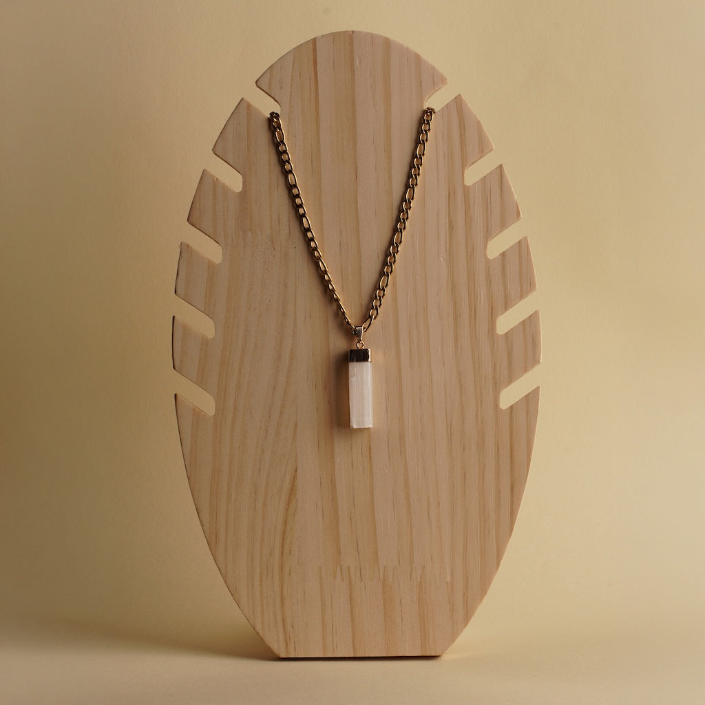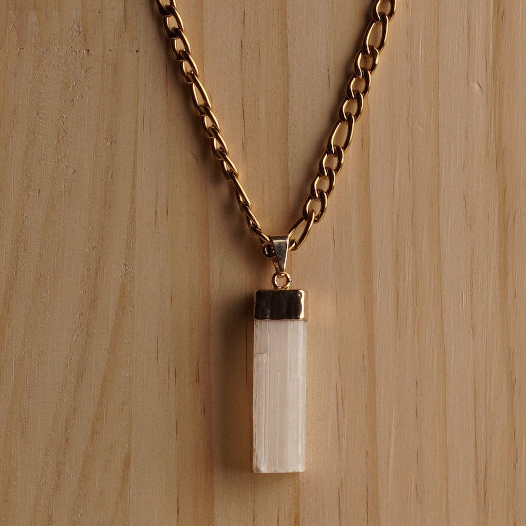 A luminous touch of purity and calm. This delicate golden necklace features a sleek white selenite pendant, celebrated for its cleansing, calming energy and connection to higher realms of light.