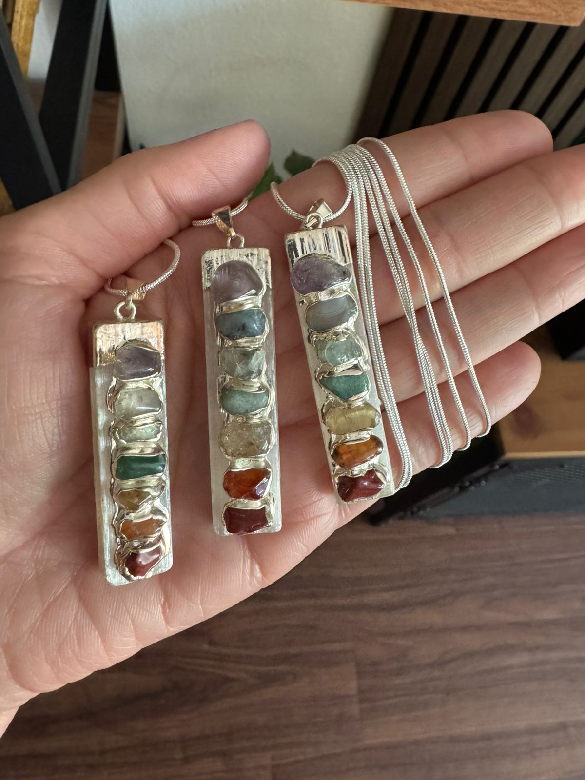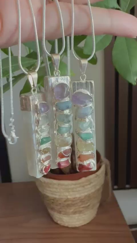A luminous white selenite pendant inlaid with seven chakra stones — a wearable guide for balance, protection, and flow. Selenite is loved for energetic clarity, helping cleanse the aura and amplify intention.