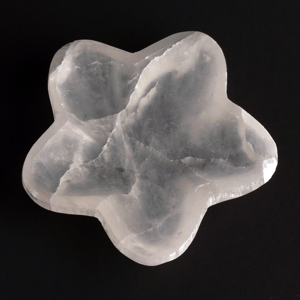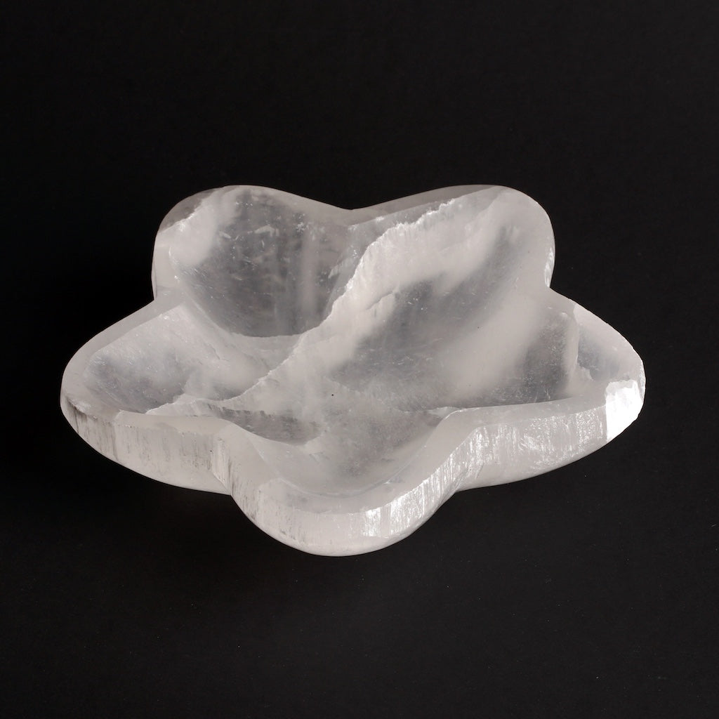 Delicate and radiant, this flower-shaped white selenite bowl is a luminous vessel of calm, clarity, and energetic balance. Perfect for holding crystals, jewelry, incense, or small ritual items, it gently clears stagnant energy, promotes peaceful vibrations, and amplifies intention in your sacred space.